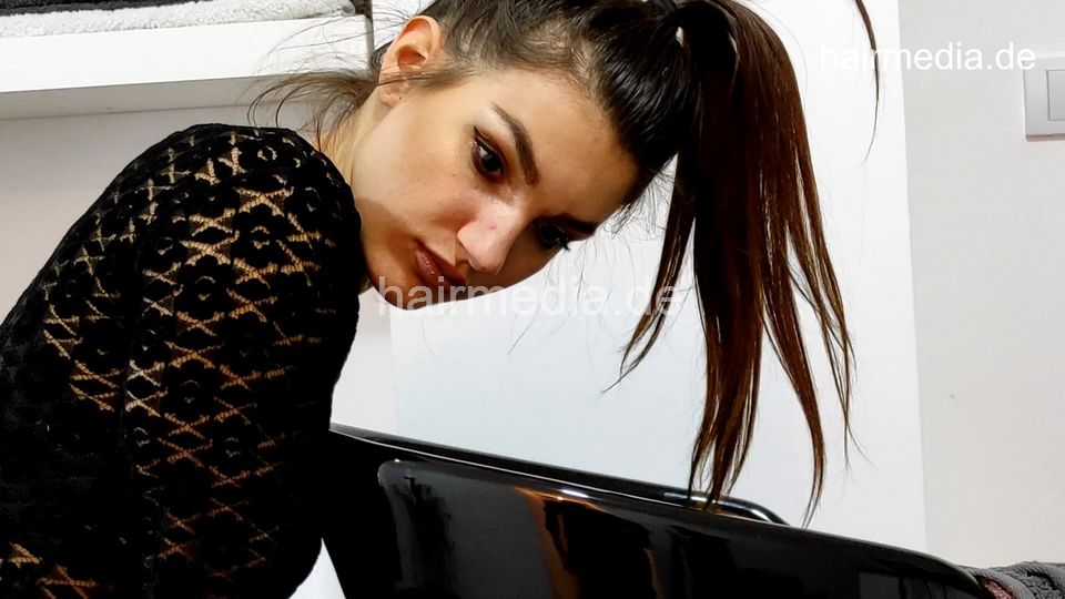 1165 Barberette Neda 220104 leatherpants shampooing by barber forward and backward, facecam