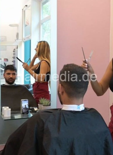 1209 Zoya serving male customer cousin 2 haircut in salon red skirt vertical video