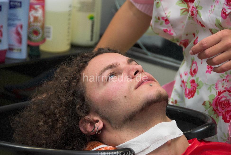 255 long hair guy Stan by AnjaS in flowerpower apron backward hairwash in mobile sink at forward bowl