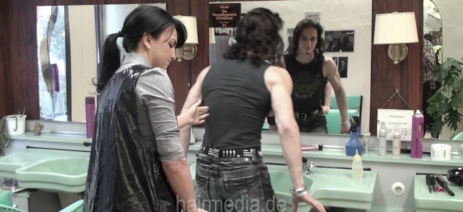 271 3 Kevin long haired guy strong forward wash salon shampoo by Illona in vinyl apron