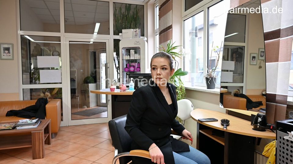 Shampoo twice, kneeling forward over backward shampoo station, conditoner twice. Bend over forward blow dry, hairshow bent over forward.