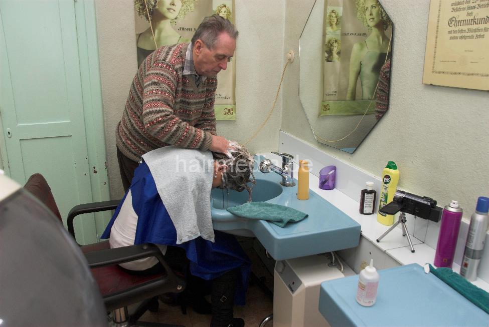 82 years old salon owner and his angry daughter give topmodel a firm forward wash and strong wetset in vintage salon