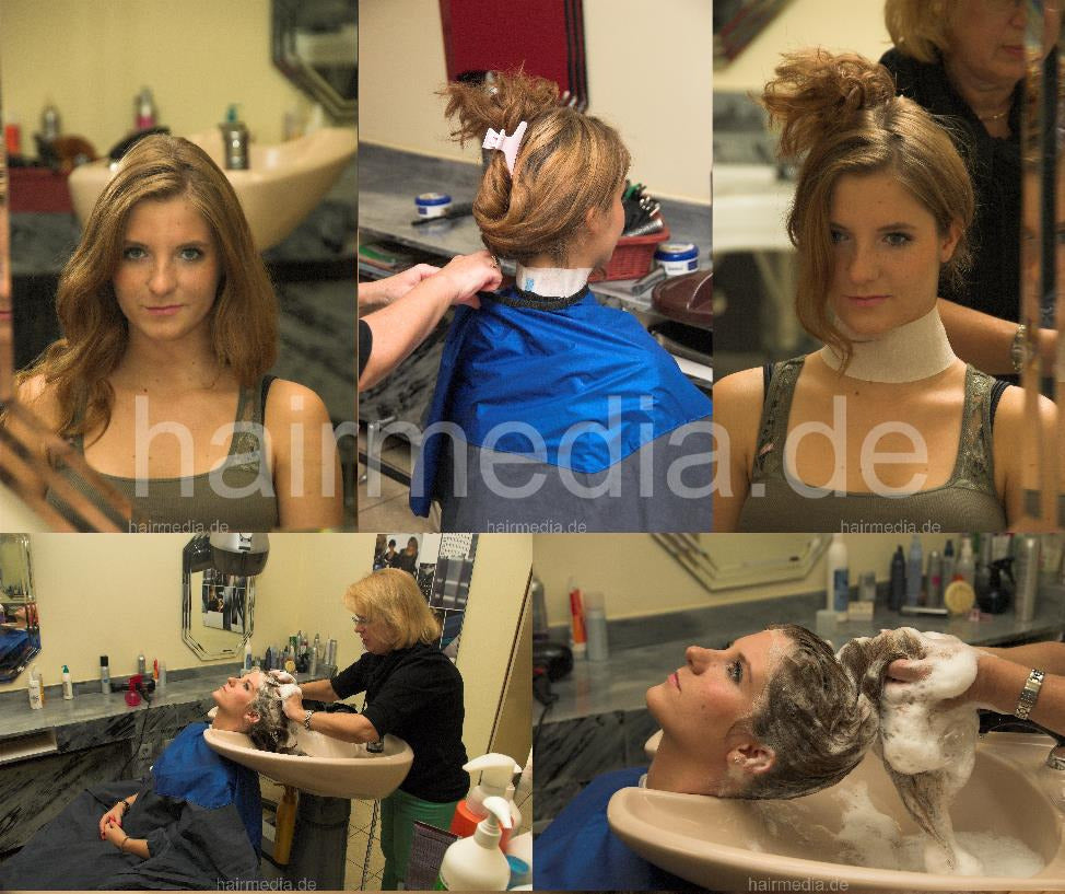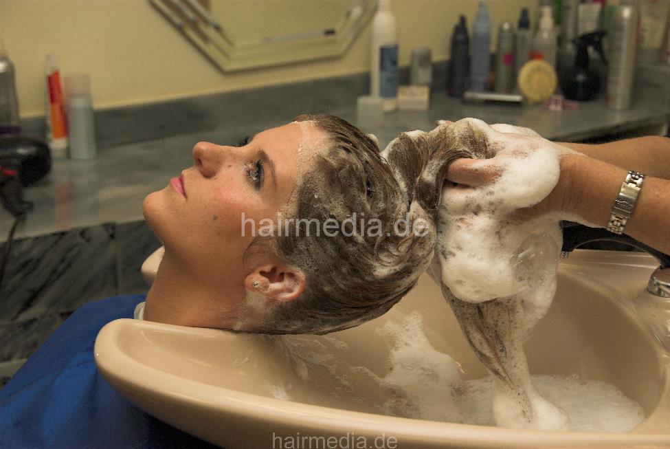 6119 SarahS wash hair by mature barberette in salon backward in Frankfurt