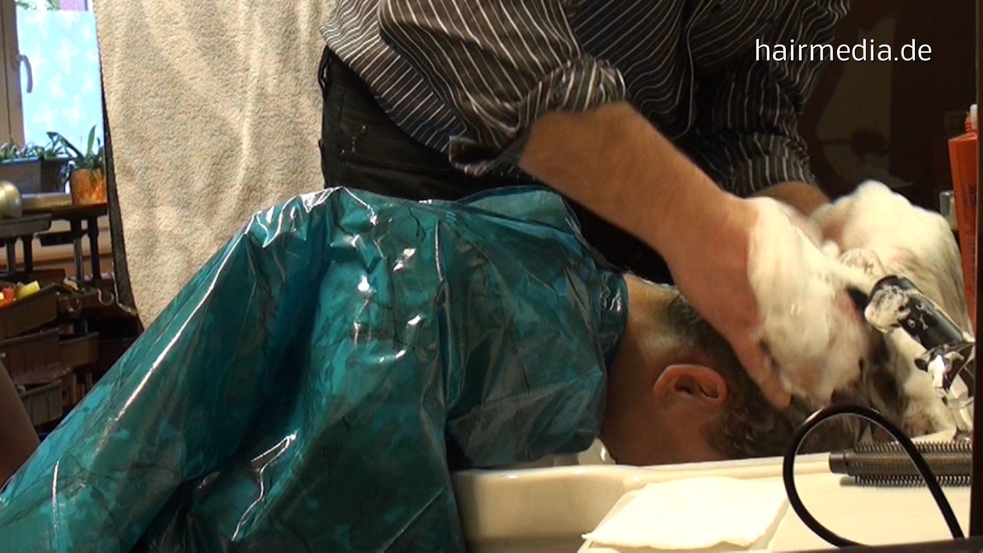 6157 ClaudiaS longhair 1 forward strong wash by barber in apron and heavy igellit cape