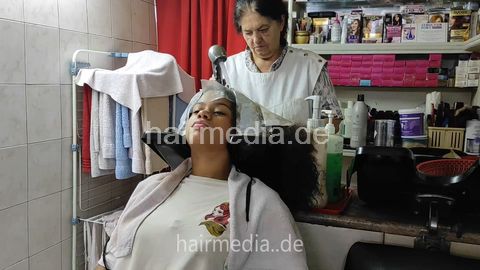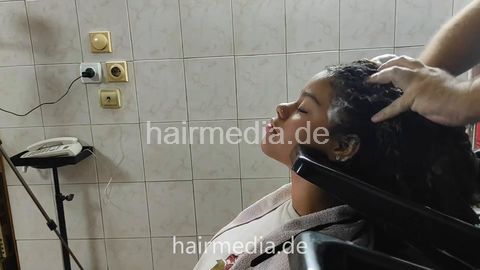 Daughter Cecilia: highlights, shampoo, cut, wetset. First she had a couple highlights then she was shampooed by me, first backward then forward in backward so we could reach all of her afro hair. Then she is having a small cut, wetset and updo. The second cam video contains only shampoo scenes.