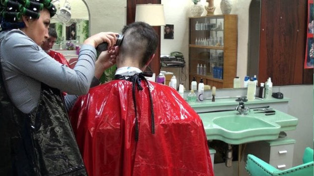 8064 Ilona 5 buzz Laura headshave by barberette in rollers and vinyl apron