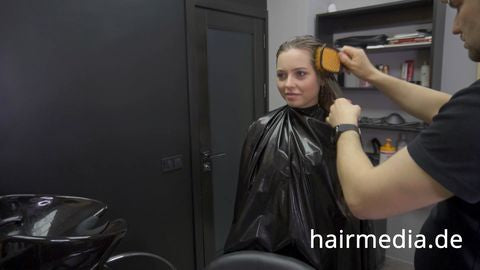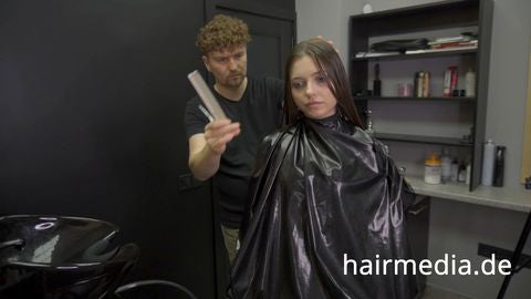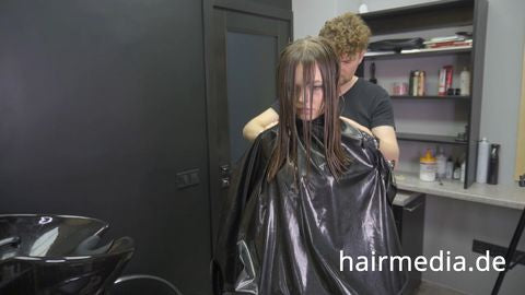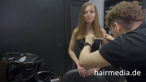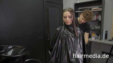 8165 Irina braces 2 haircut by Ukrainian barber in RSK leatherdress and black vinylcape complete