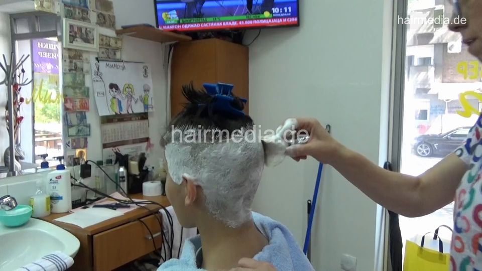 8402 Bojana chewing teen 2 headshave, knife and shaving cream in barbershop by female barber JelenaB