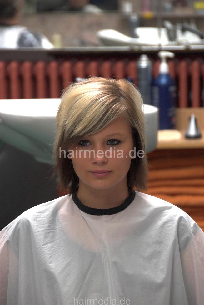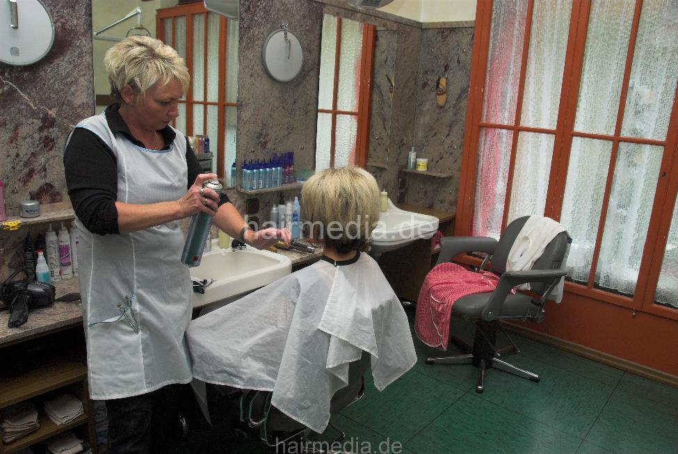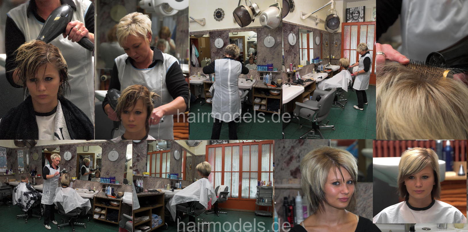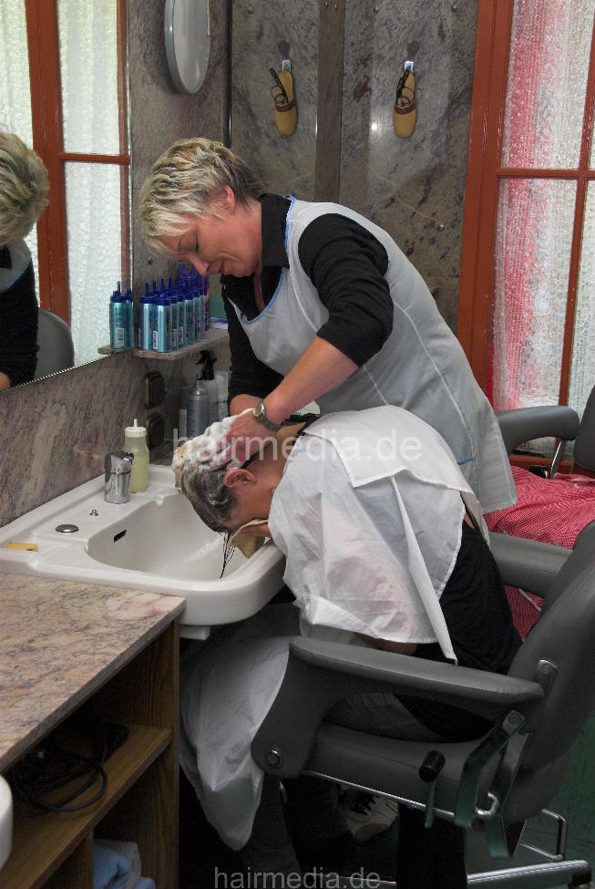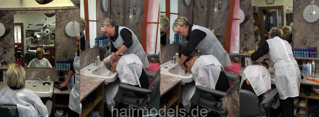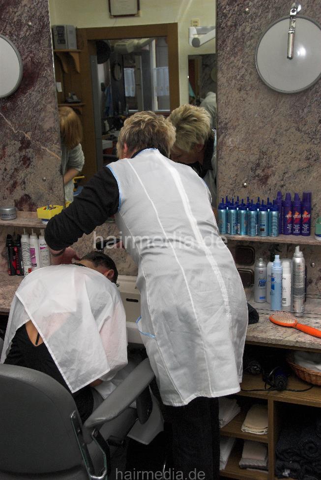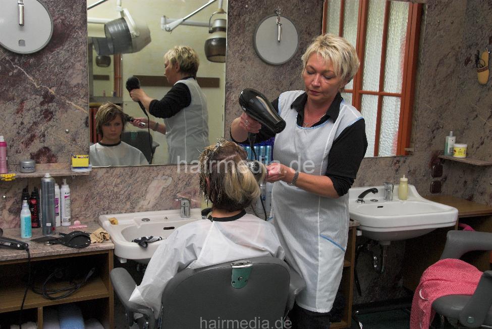 b011 Teen Jessi strong forward wash and blow by mom in white apron in vintage salon