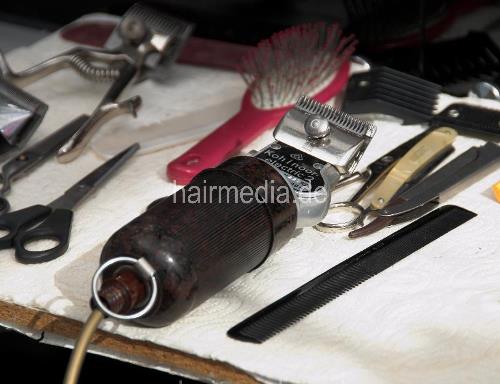 Elektrische Hand-Haarschneideapparate lösten in den ersten Jahrzehnten des 20. Jahrhunderts die mechanischen Haar-Clipper ab. Der austauschbaren Schneidekopf erleichterte den Herrenfrisör die Arbeit. Zugleich schaffte er in der Stunde wahrscheinlich einen Haarschnitt mehr. Das Bakelit-Gehäuse gilt als absoluter elektrischer Widerstand. Das ermöglichte dem Frisör eine sicheres Gefühl vor Stromschlägen. Ungewöhnlich sind die brunierten Schneide-Platten und die abdecktende Ober-Platter aus Kunststoff (Bakelit).
