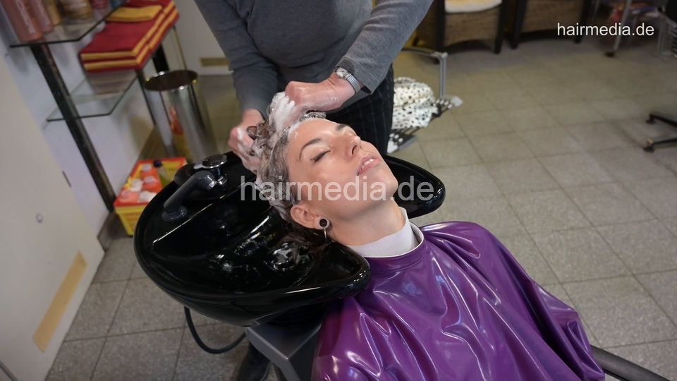 1176 Geraldine 1 backward salon black bowl shampoo in knitwear and pvc shampoocape
