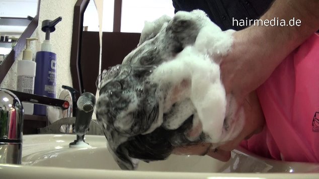 199 3 Melanie forward shampooing by old barber in pvc apron