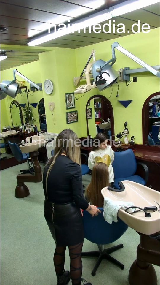 544 Barberette Paulina younger daughter 2nd run hair kneeling fresh styled forward wash and blow - vertical cam