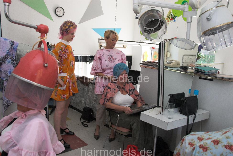 672 Part 6, backward shampooing and rollerset flowerpower apron and haircutcape