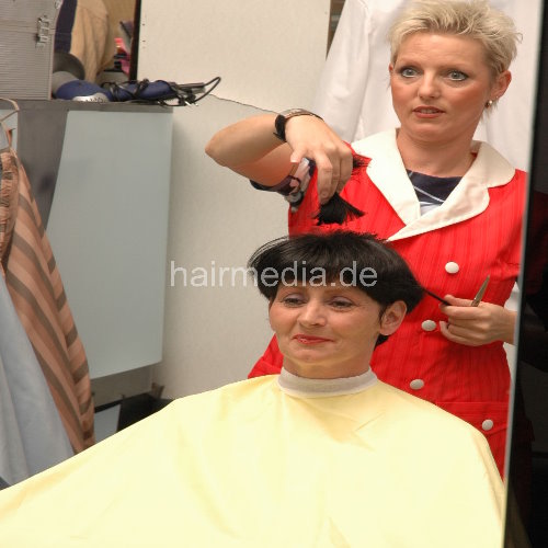 Get rid of long locks and trust the red-dressed hairstylist for a stylish and confident look. Short hair, don't care!