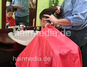 barberette student Maria first day forward shampoo curly hair by barber, student Maria watching