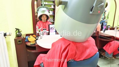 forwardwash, scalpmassage using several capes at same time, nylon and vinylcapes, Alcina shampoo and Alpecin scalpmassage, wetset, hooddryer