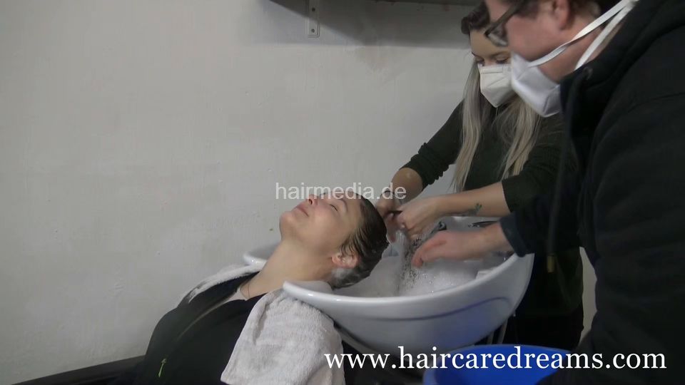 Sarasa - complete video: backward shampoo, bowl haircut, second haircut, rollerset, bleaching, dying, haircut, perm, short perm. Done by barber Tomaso and barberette in Facemask