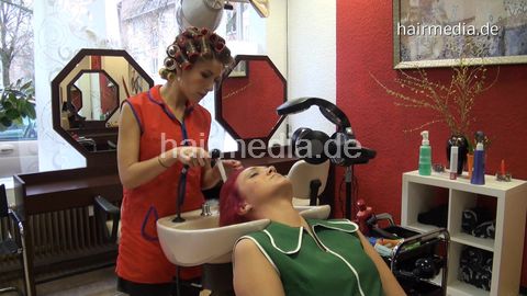 Redhead barberette in nylons and green zipperapron Nylonkittel get her hair done. Pampering backward salon shampooing and wetset by colleauge.