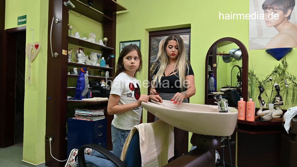 Paulina is determined to go above and beyond for her daughter's salon experience. She sets up a shampoo station where she will shampoo her daughter four times in a forward manner. With each shampoo, she ensures every strand of hair is thoroughly cleansed and nourished.