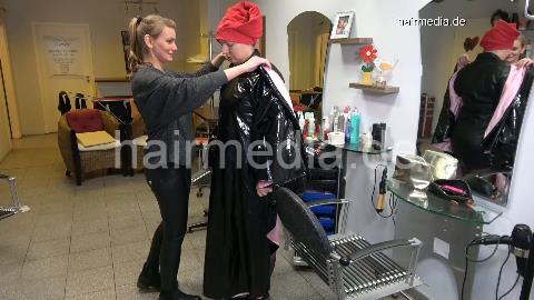 1152 curvy TineZ in leathercoat vinylcape salon shampooing forward by leatherpants barberette, Zoya controlled