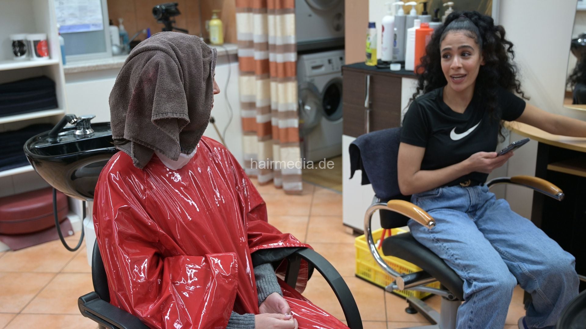 1171 Liesa 2 backward salon shampoo by Amal in red vinyl cape and neckstrip