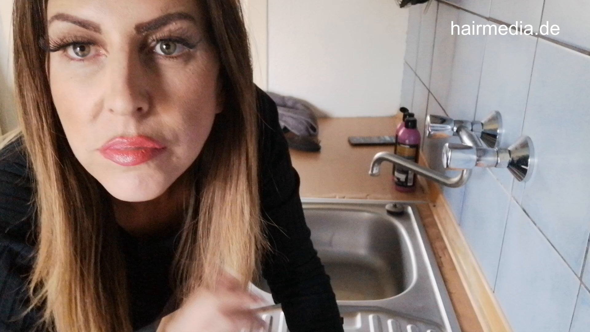 1195 Francesca 220425 self home kitchen sink shampooing forward hairwash and smoking styling