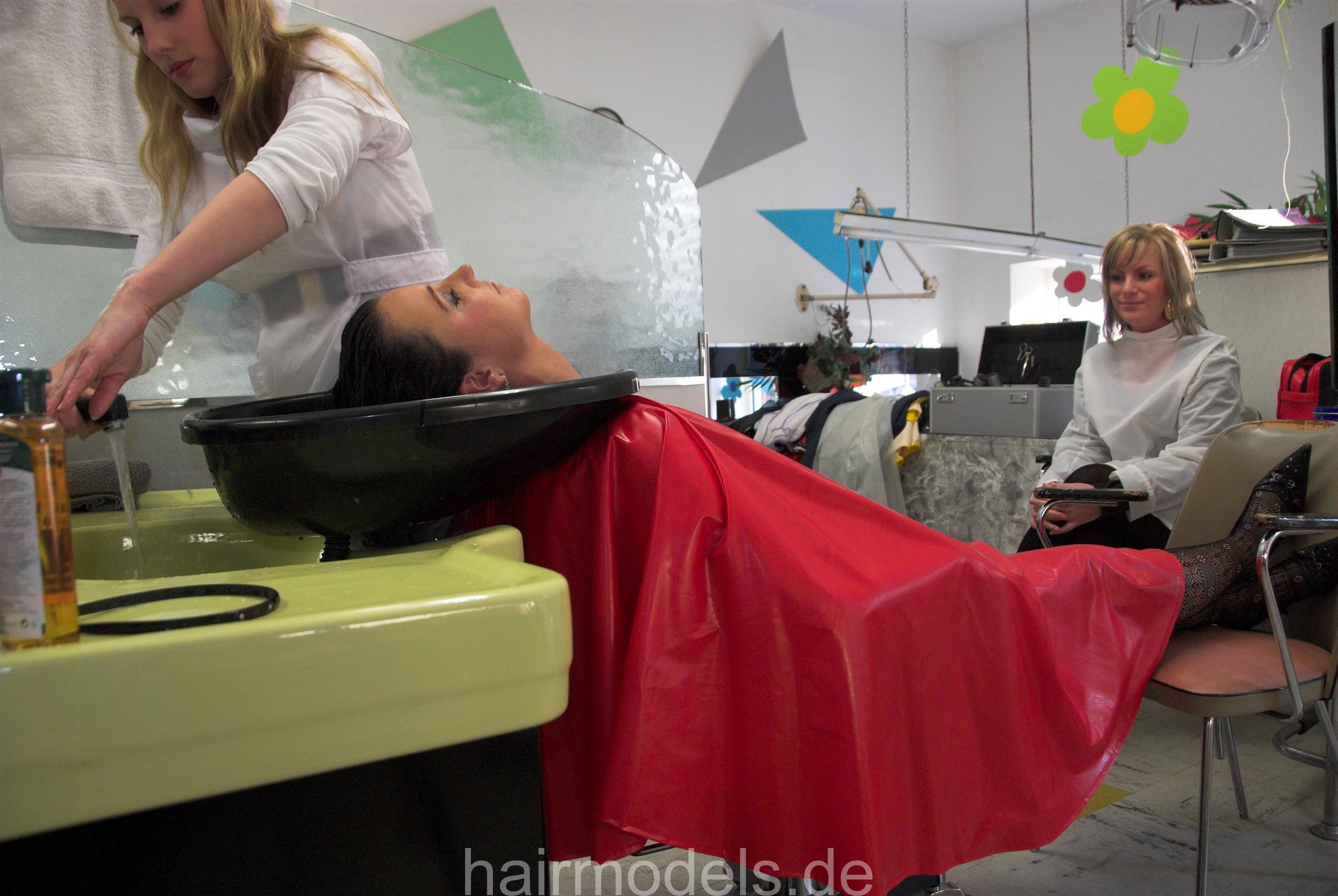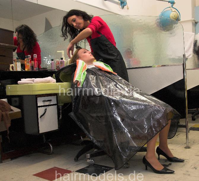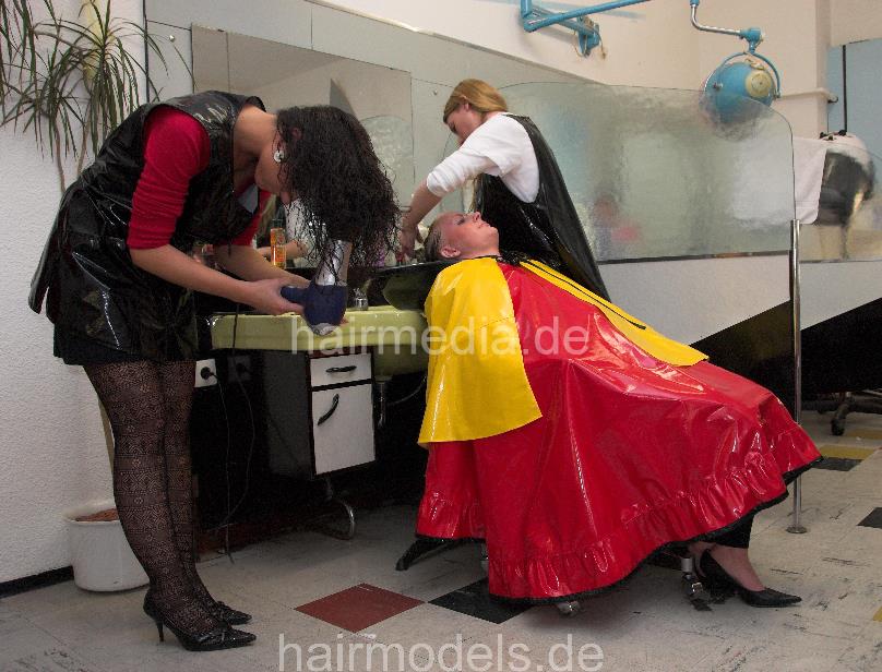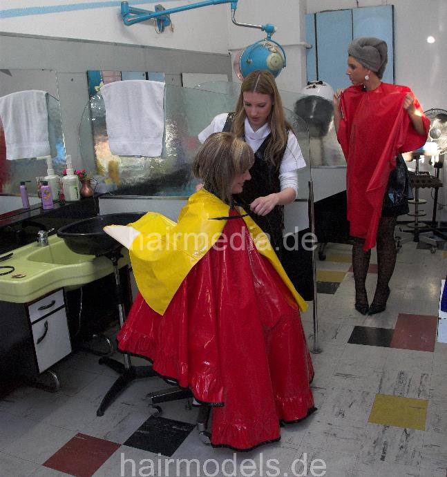 AnjaS, Valora, Judith Shampooing, wetset, fakeperm in lots of different capes and aprons. White RSK dederon Rückenschlusskittel apron.