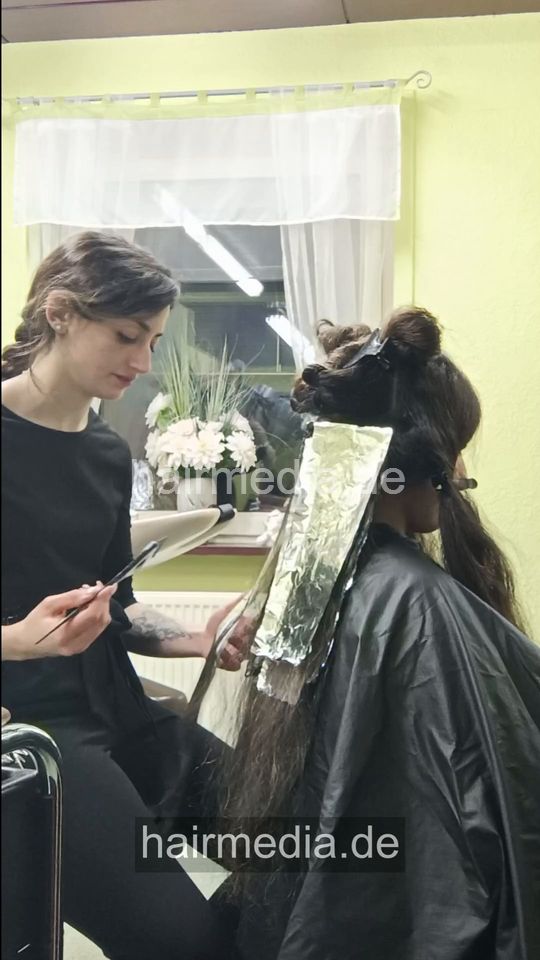 4122 Leyla at work on Mahshid doing french balayage on very thick XXL hair and braiding