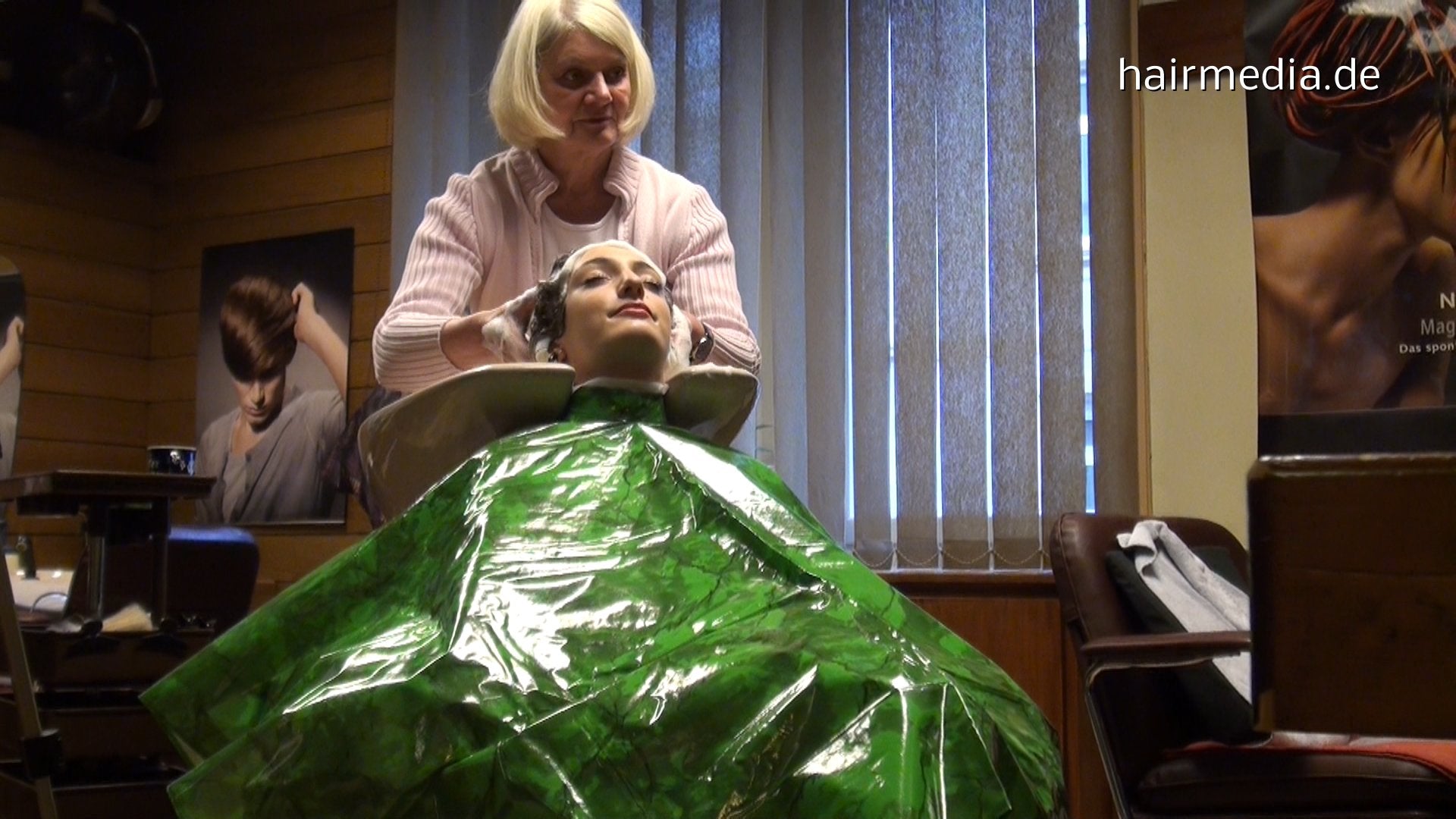 6158 Damaris 1 backward salon shampooing hairwash in heavy green plastic shampoocape