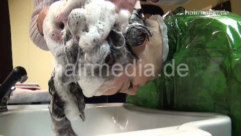 6158 Damaris 2 strong forwardwash salon shampooing in heavy green plastics cape