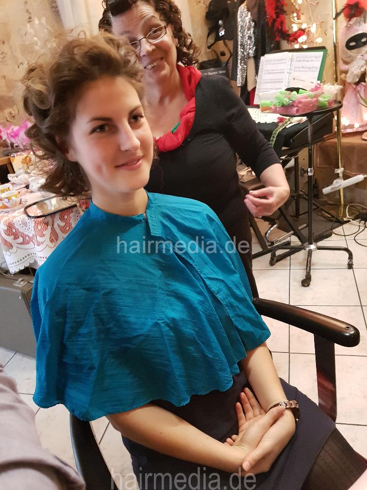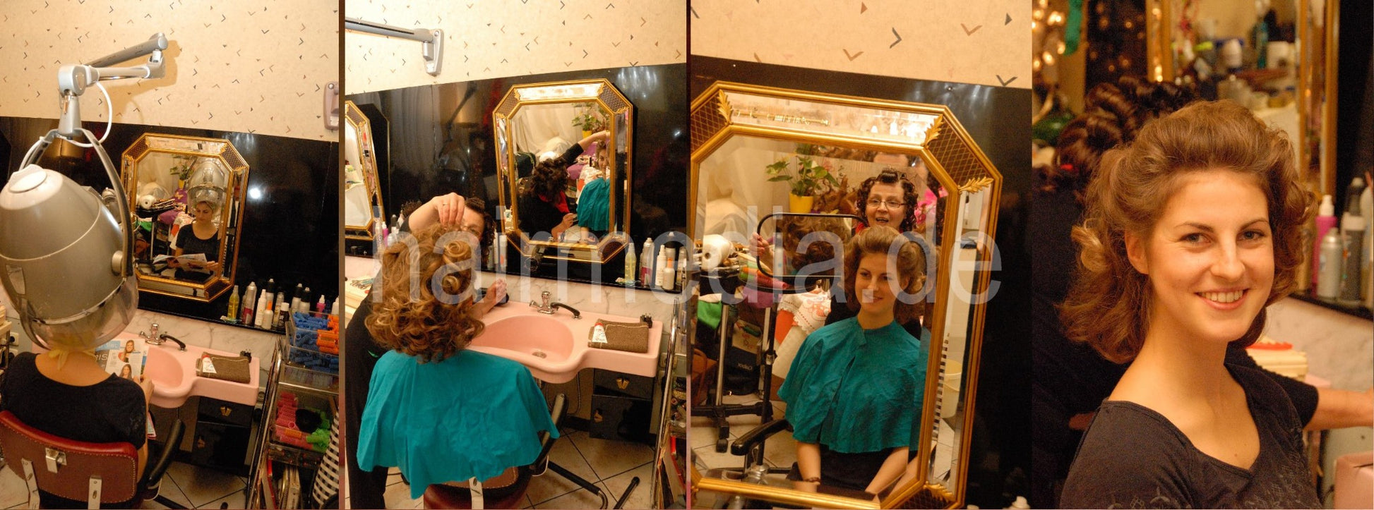 Nuremberg Salon. Classic wetset, vintage style. Hairnet used at metal hooddryers. Comboutcape Frisierumhang, Ausfrisierumhang used.