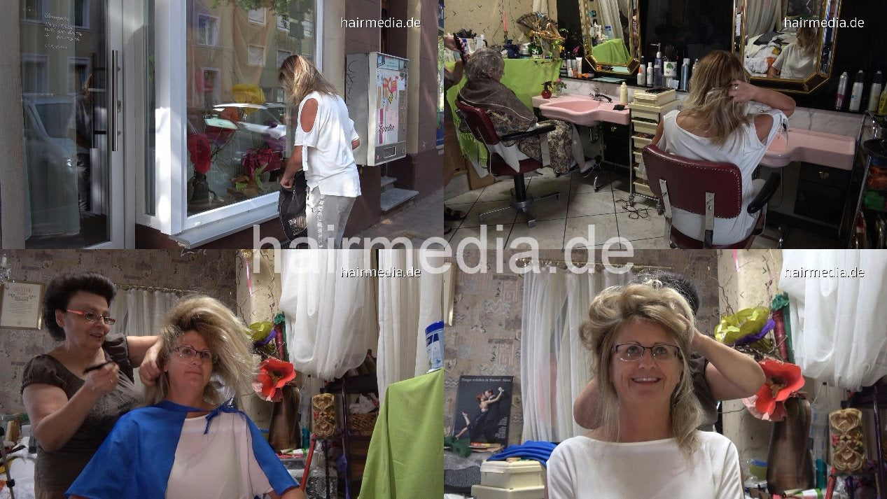 MarikaS teasing dry hair, firm forward shampooing, wetset and updo vintagehair classic style by mature barberette. This is the firm shampoo part. Done by mature barberette in vintage style pink forwardbowl head over. Uncomfortable position.