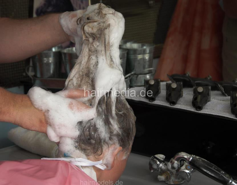636 2 Janice teen forward manner shampooing by barber in barbershop bowl