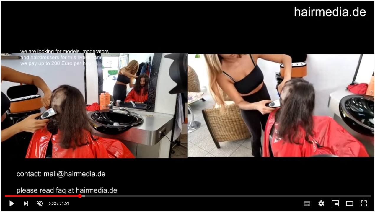 1050 220423 Zoya buzzing and headshave long haired guy in red PVC cape