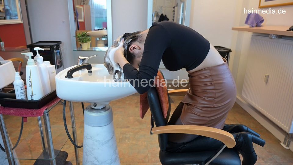 1172 AlinaR JMK custom self salon shampooing over backward bowl in leather