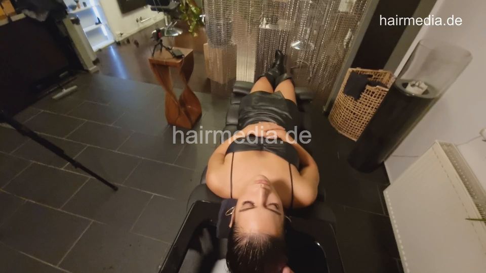 1181 AlinaR 2 backward pampering shampoo in leatherskirt and boots by barber POV cam