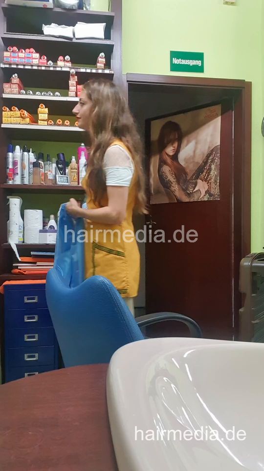 1237 Leyla in apron shampooing and scalp massage Alpecin client - vertical video