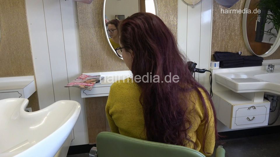 1238 Tetjana 2 dry haircut long and thick hair in green cape by barber