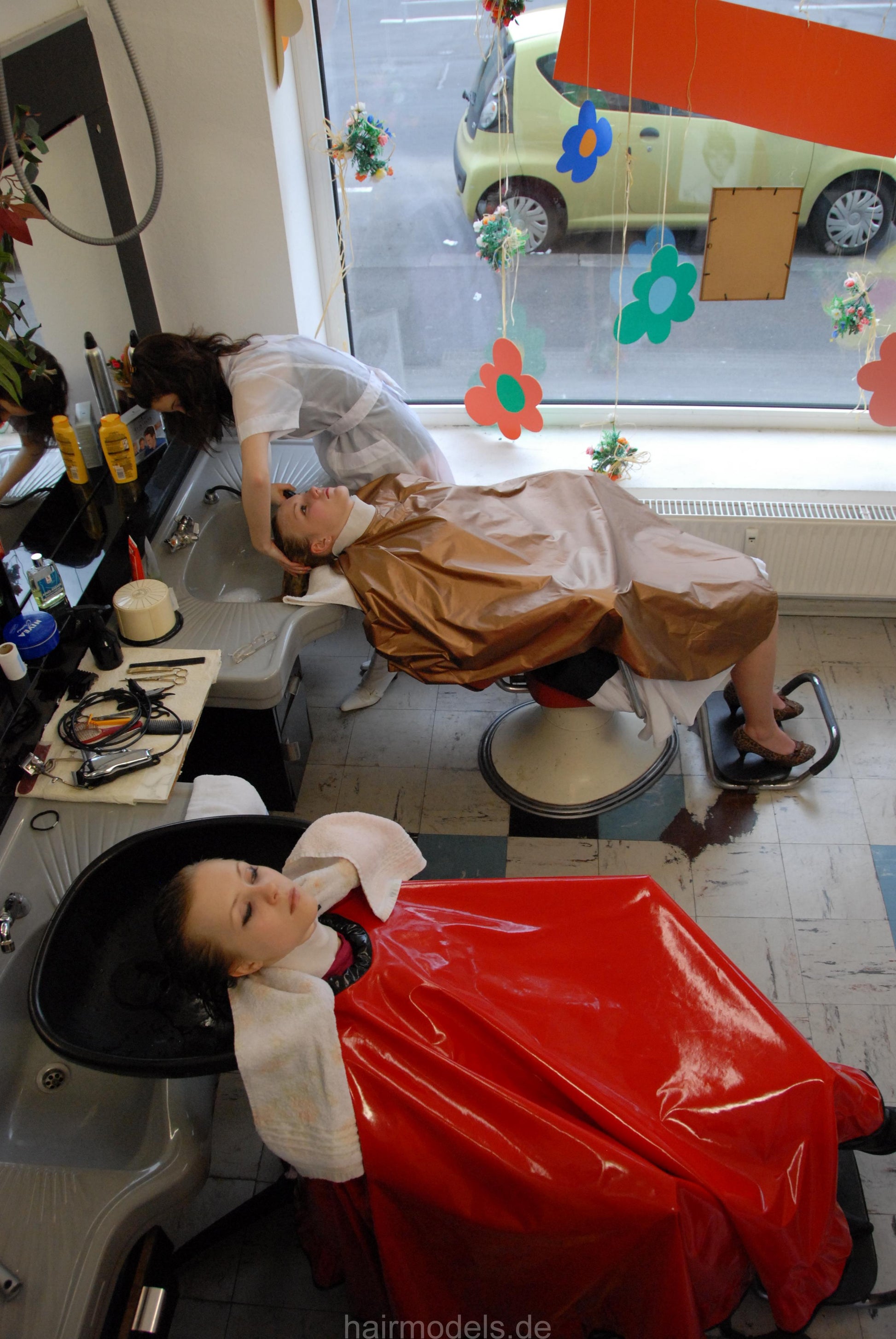 apron, caping, pvc, vinyl old fashion shampooing and blow dry Models: KathrinK SonjaW