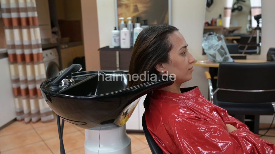 315 Barberette Hasna 4 backward shampooing by barber haircare in red PVC cape sideview