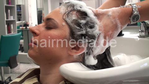 350 Oxana by Jacqueline backward salon shampooing in green nylon apron