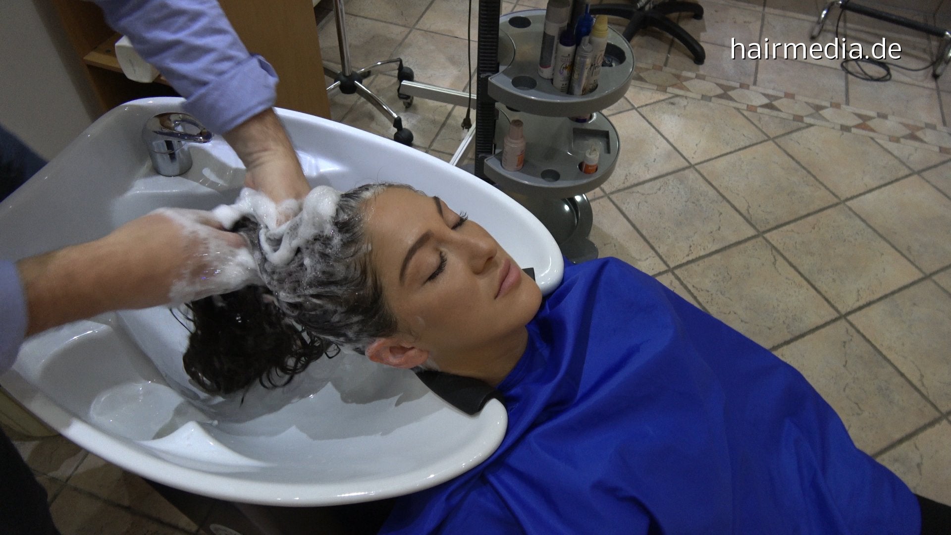 371 AlisaF by barber backward shampoo in blue cape