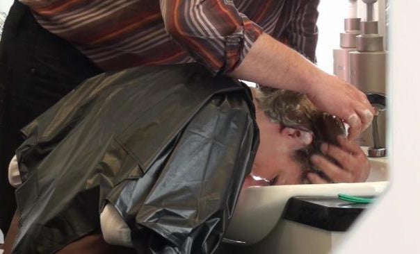 4103 Barberette ManuelaZ 2 strong forward wash salon bowl by barber in black pvc cape