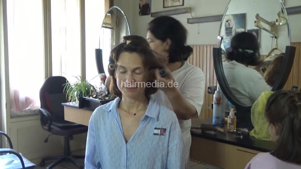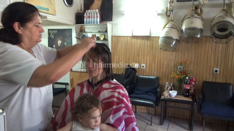 KathrinP mother - mom came with very young DunjaP kid and DinaP kid. Regular shampoo cut and foenen for the girls and the same for the mother except she is going a little bit under the dryer.