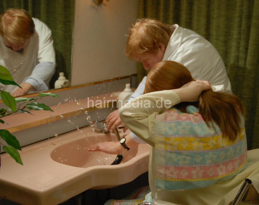 726 Candy redhead in kimono old barber forward wash shampoo sprayer accident