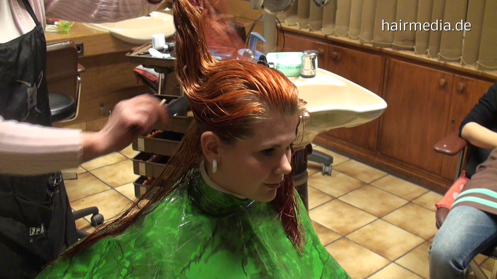 8097 JuliaH 2 cut redhead in heavy green pvc plastic apron cape