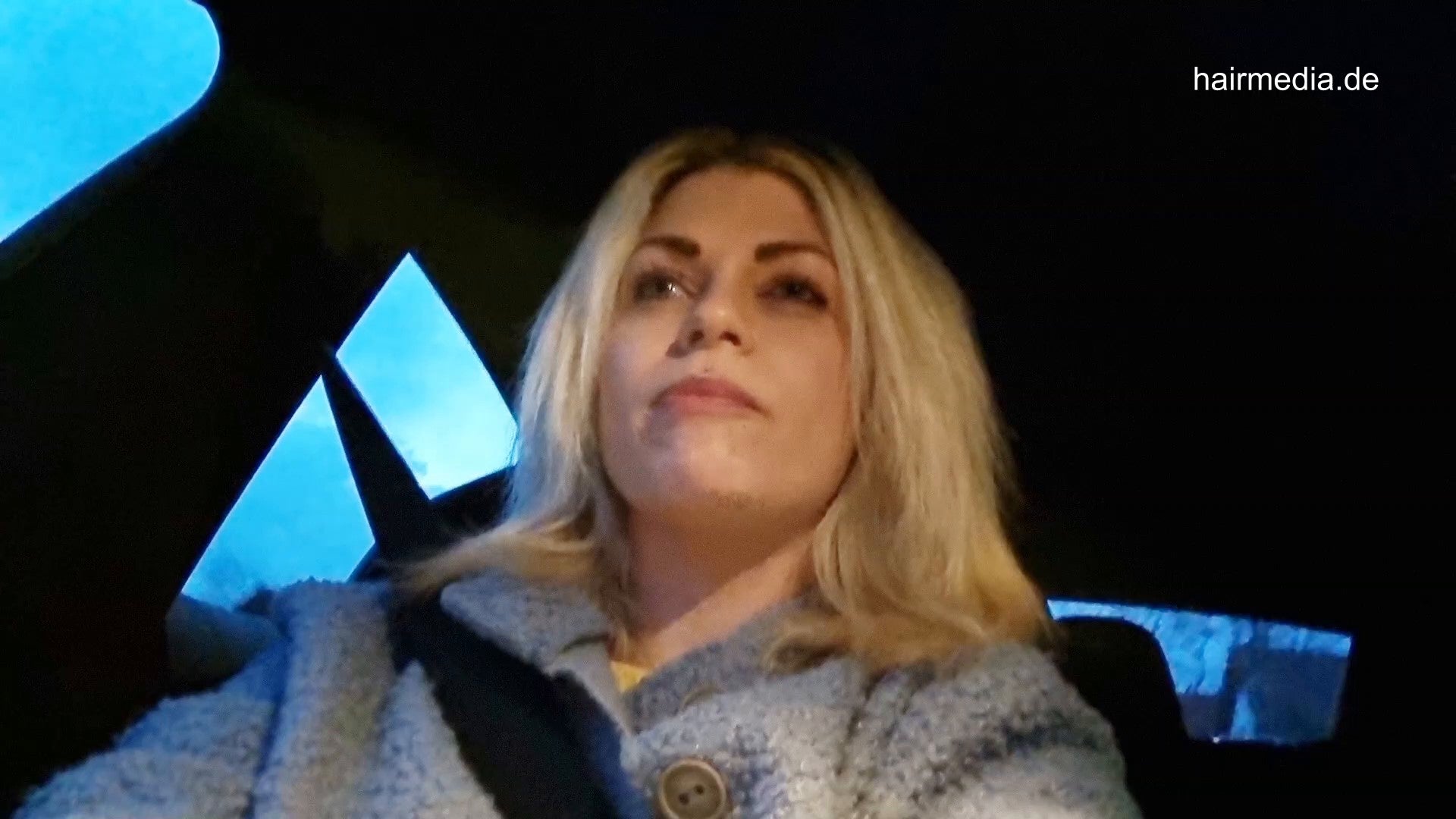Barberette MariaK while driving in superfast car. Chewing gum accident. She visits a barbershop to get help to get it out. The old male barber got a solution. The clippers.