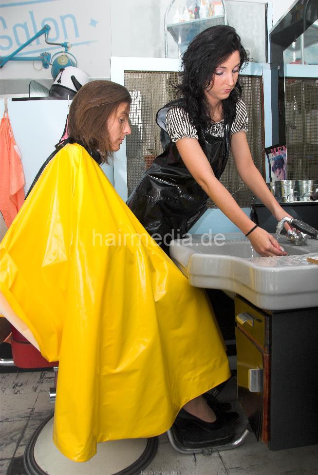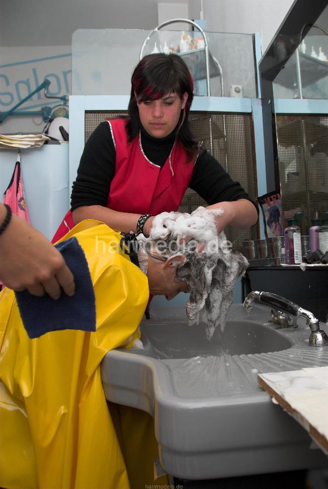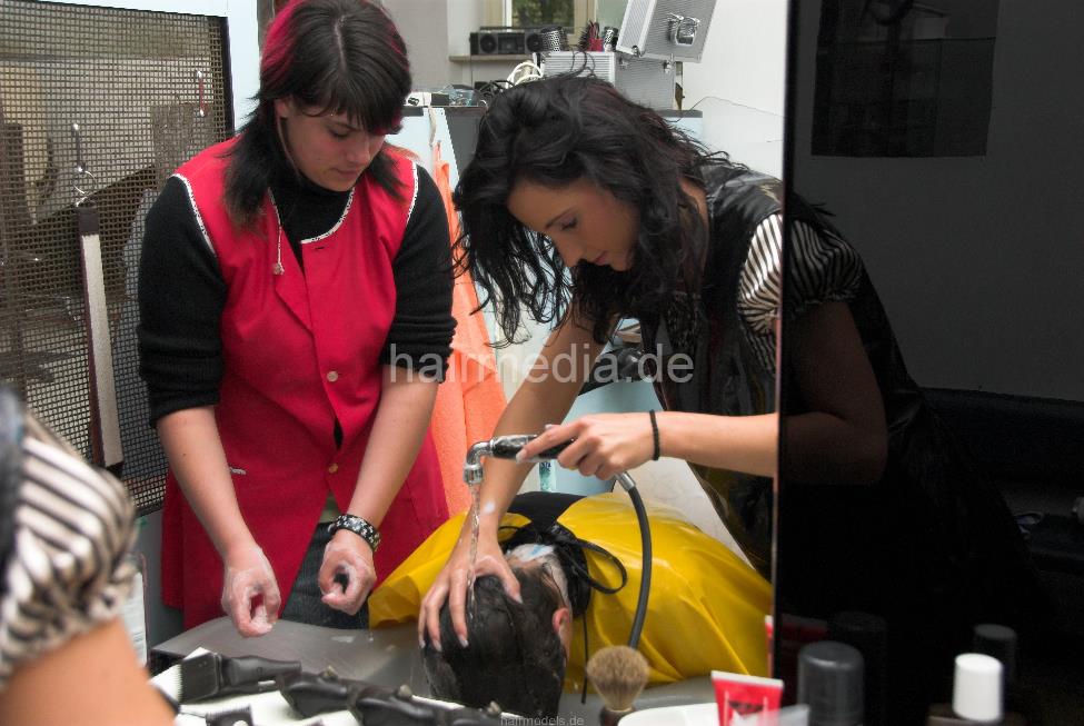 Sandra wants a job in kultsalon. But salon boss AnjaS does not like her hair. She told her, she can not work with that damages hair. They tried to shampoo and perm it but Anja is not satisfied. Finally she went bald to get that job.