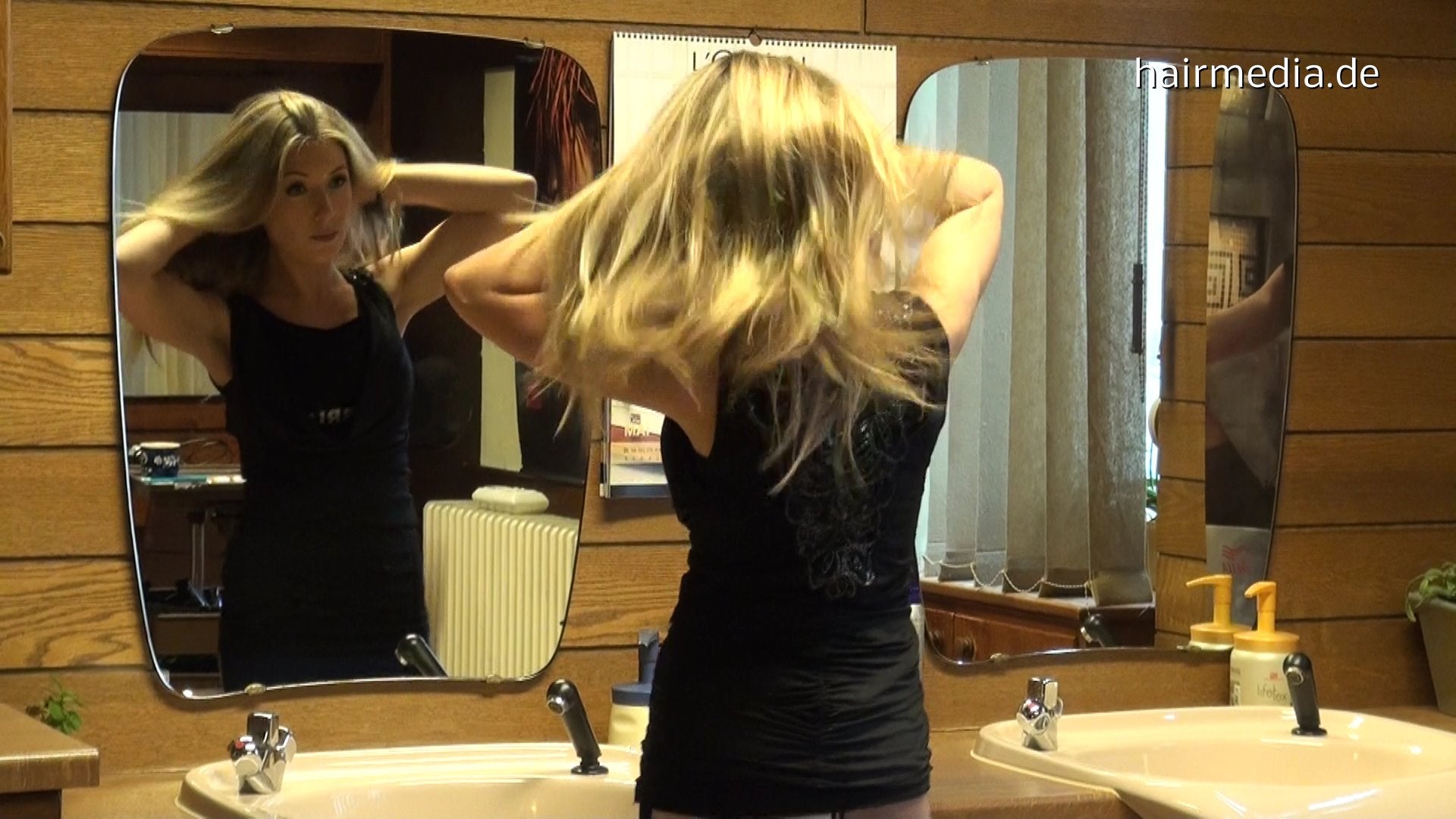 A lone in a row. Barberette self shampooing in salon. Standing position, bend over forward over forward bowl
